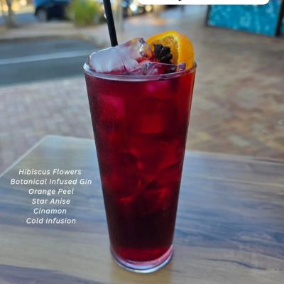 Bright red and oh so delicious. A homage to the summertime drinks of Mexico. This quencher is made from dried hibiscus flowers, orange peel, cinnamon and a range of other spices. Served tall, very chilled, and a slice of orange for that summer vibe.